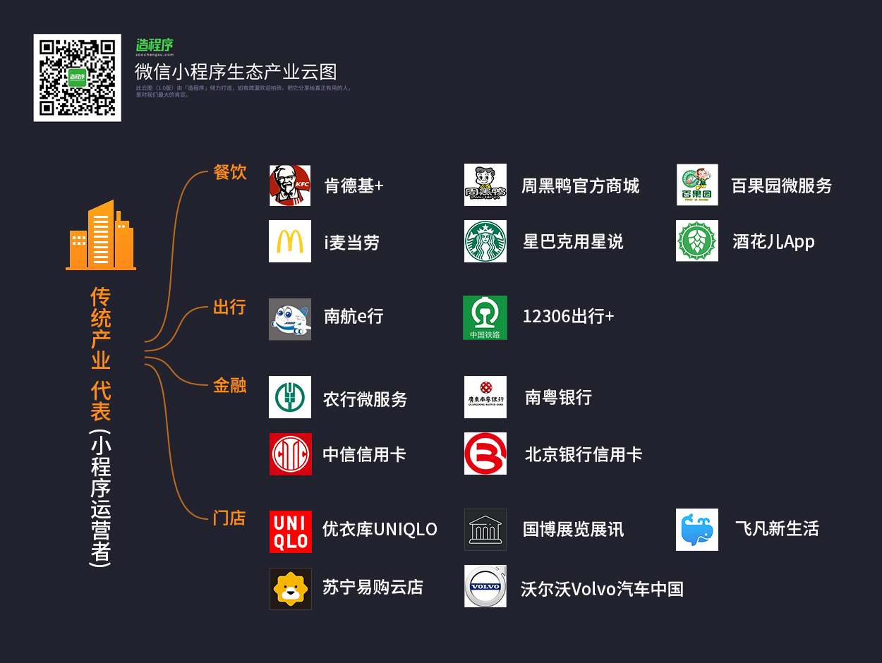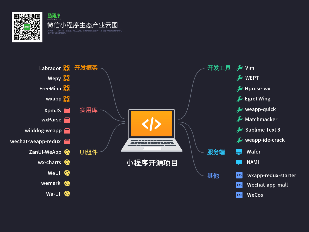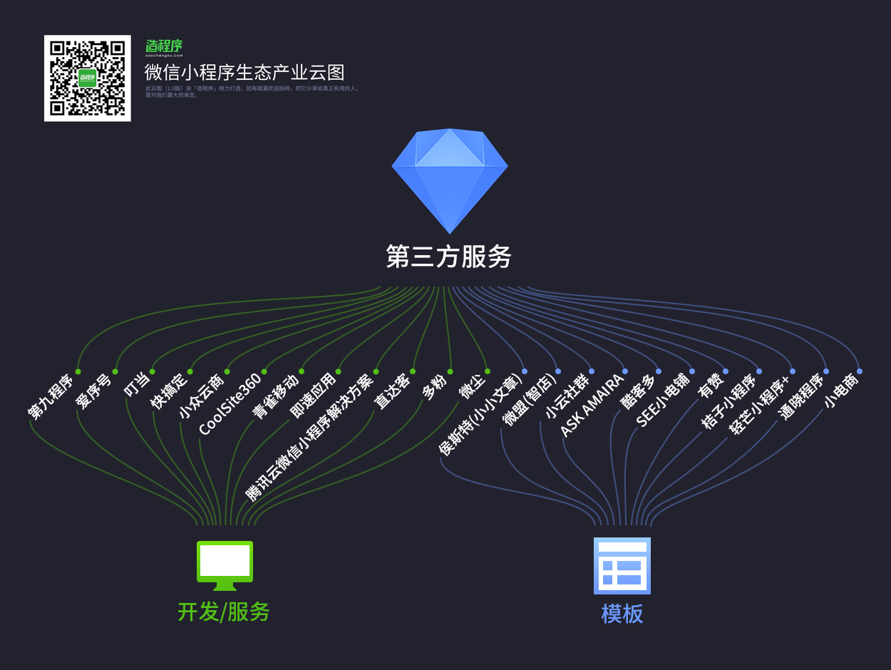 「微信小程序生态云图」由微信公众号「造程序」团队策划出品,花费了大量心血,仍不免有疏漏,未来我们会不断迭代,不断完善,力求让大家看到一个最全面、最具参考价值的小程序生态圈,关注微信公众号:造程序(微信号:zaochengxucom) 获取更多新鲜专业微信小程序资讯。在公众号,回复“云图”,可获取高清版微信小程序生态产业云图。
