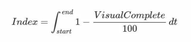 Fisrt Visual Change、Last Visual Change 分别表示首次和最后一次视觉发生变化的时间点,Speed Index、Perceptual Speed Index 均为视觉速度,两者的区别在于背后所用到的算法不同,前者采用了 Mean Pixel-Histogram Difference 算法,后者则采用了 Structural Similarity Image Metric 算法,其中 Perceptual Speed Index 的统计结果更贴近用户的真实感受。Speed Index 的算法如下,它代表了我们页面在加载过程中视觉上的变化速度,其值越小代表感官性能越好: