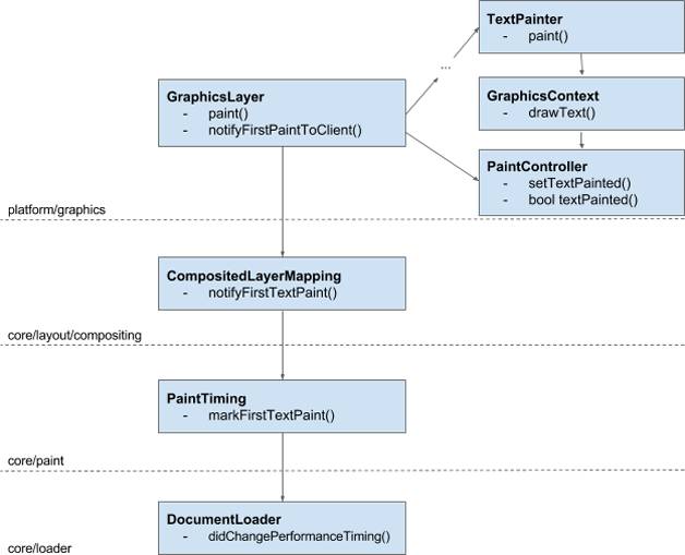 如图 2 的流程图展示了 Blink 内核中 Time-to-first-X-paint 的分析原理和上报路径(其他 first-X-paint 的指标类似)。