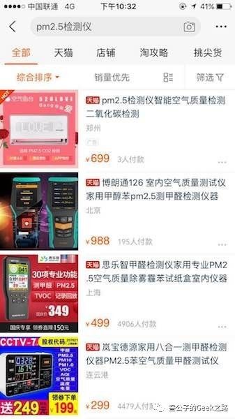 那么,我们先来淘宝一下,看看成品的PM2.5检测仪都是什么价位的。这里可以看到700的、1000的、500的,什么价格的都有。