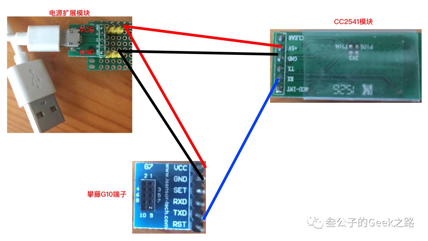 这里蓝牙和传感器模块都需要电源,所以需要一个电源扩展模块,各自连接一下电源,需要四根杜邦线。数据的传输和上面的差不多,将传感器的TXD端连接到蓝牙4.0模块的RXD端就好了,只需要一根杜邦线。