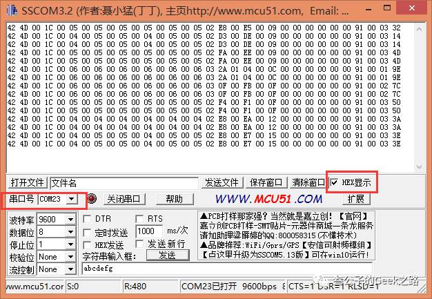 打开串口调试助手后,选择刚刚在设备管理器看到的端口(我这里是COM23),并选择HEX显示,最后打开串口。