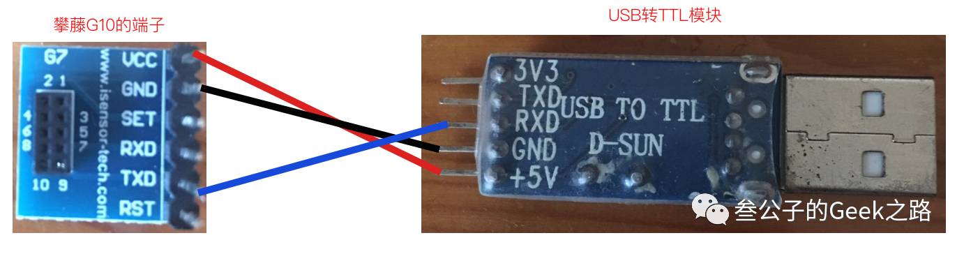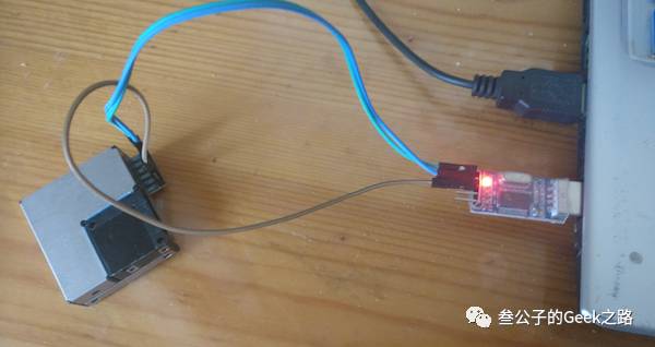 其中两者的VCC与VCC相连接,GND与GND相连接,用作供电。第三根线,将传感器的TXD连接到USB转TTL的RXD上,传感器作为一个数据产生者需要通过发送端(TXD)将字节数据发送出去,而USB转TTL通过接收端(RXD)接受传送过来的数据,并通过USB传送到电脑上。