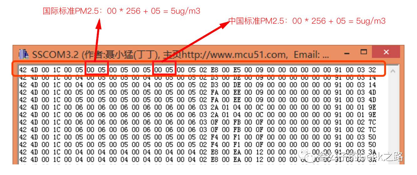 可以看到前四位都是不变的,也就是 424D001C,然后第7、第8位代表国际标准的PM2.5值的高位和低位,第13、第14位代表我国标准的PM2.5值的高位和低位。最后计算结果就是高位x256+低位就好了。