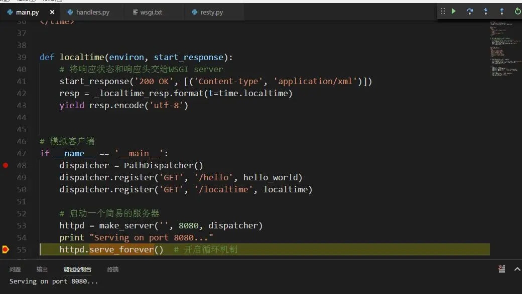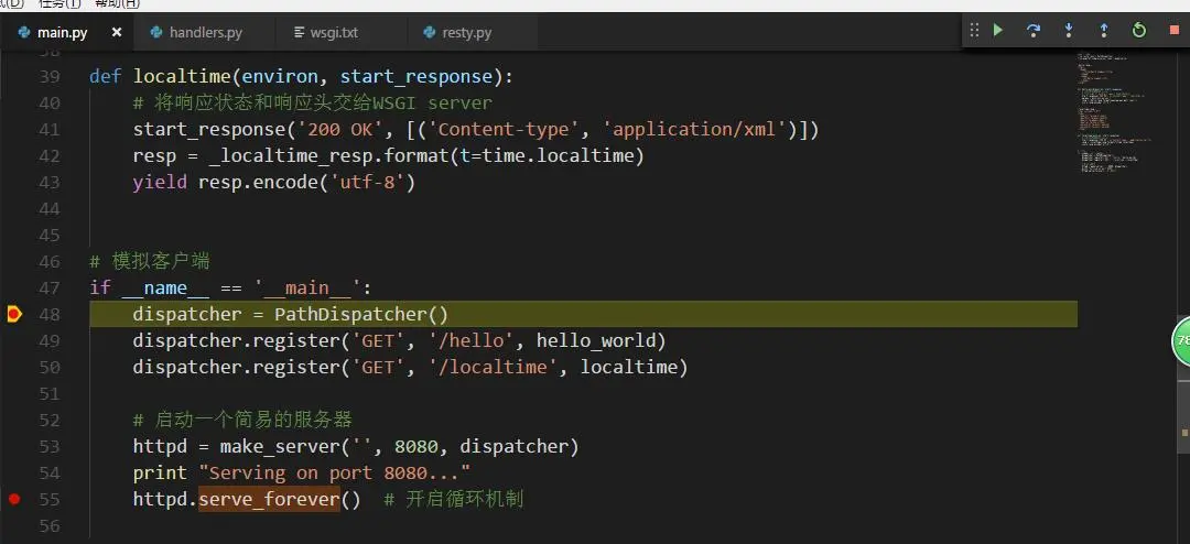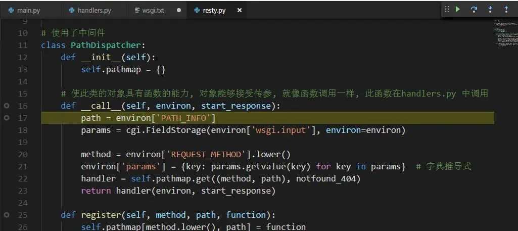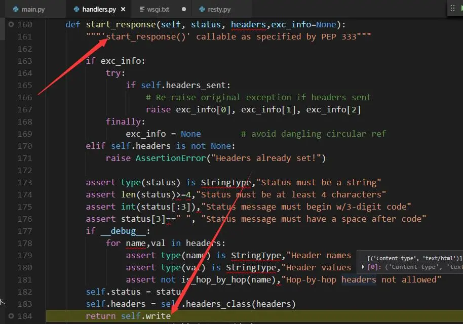 我分别在main.py, handlers, resty.py下了断点, 开始debug把....