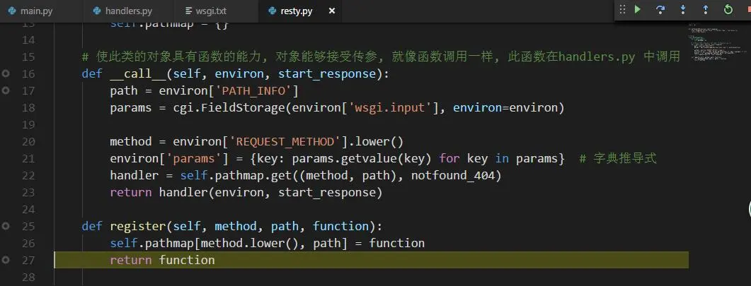 15 # 使此类的对象具有函数的能力, 对象能够接受传参, 就像函数调用一样, 此函数在handlers.py 中调用