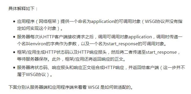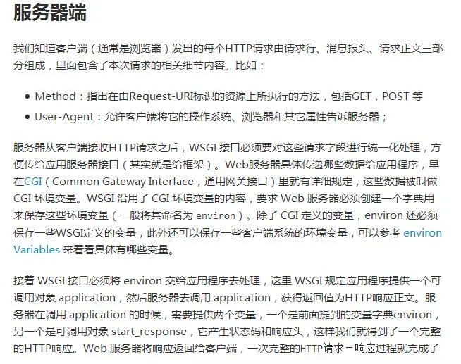 简单来说,Web服务器是在运行在物理服务器上的一个程序,它永久地等待客户端(主要是浏览器,比如Chrome,Firefox等)发送请求。Web 服务器接受 Http Request,返回 Response,很多时候 Response 并不是静态文件,因此需要有一个应用程序根据 Request 生成相应的 Response。这里的应用程序主要用来处理相关业务逻辑,读取或者更新数据库,根据不同 Request 返回相应的 Response。两者之间的桥梁就是WSGI。