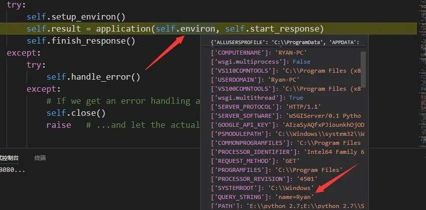 图15注意下envron变量的值, 这就是一个dict类型的变量, 可以看到, 我们在浏览器中的 "?"后面的key-value都给保存进来了。传给了python应用程序。