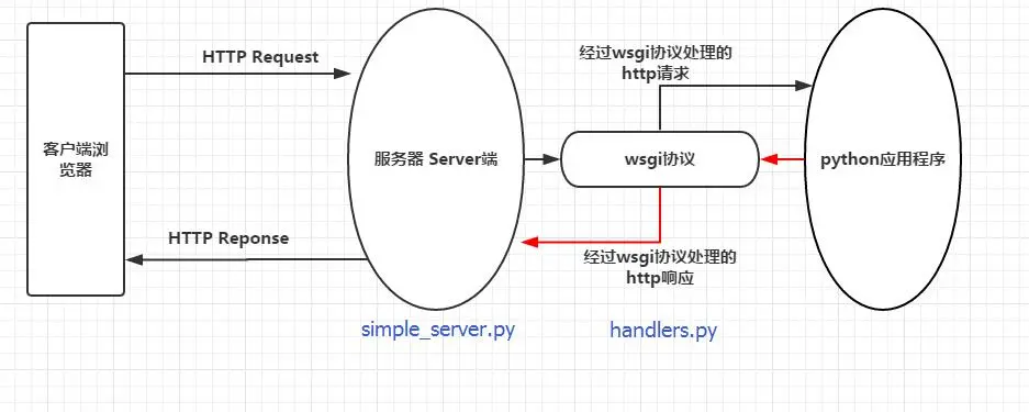 simple_server.py模拟了一个简单的web服务器, handlers.py是wsgi协议对http协议的封装处理函数。看下图吧: