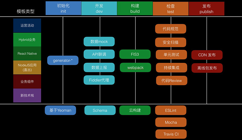 随着前端工程的不断演进,一方面工程变得日趋复杂,同时对规范和质量的诉求在不断增加。现代化web工程应该包含以下几个阶段:初始化、开发、构建、检查、发布。如下图所示: