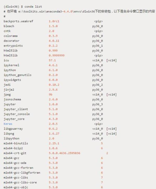 完成以上安装和配置后,我们应该在 dlwin36 conda 环境中看到以下软件包列表: