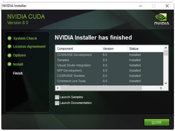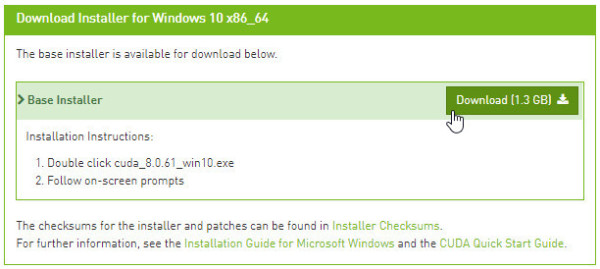 - CUDA 8.0.61 (64-bit):CUDA 是一种由 NVIDIA 推出的通用并行计算架构,该架构使 GPU 能够解决复杂的计算问题,该软件包能提供 GPU 数学库、显卡驱动和 CUDA 编译器等。
