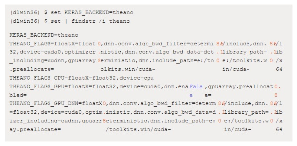 - 系统环境变量 THEANO_FLAGS_GPU_DNN 的值定义为:floatX=float32,device=cuda0,optimizer_including=cudnn,gpuarray.preallocate=0.8,dnn.conv.algo_bwd_filter=deterministic,dnn.conv.algo_bwd_data=deterministic,dnn.include_path=e:/toolkits.win/cuda-8.0.61/include,dnn.library_path=e:/toolkits.win/cuda-8.0.61/lib/x64