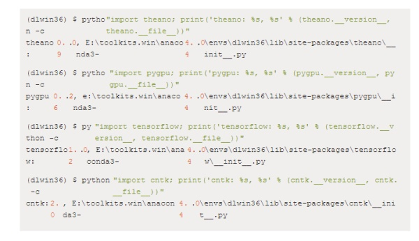 为了快速检查上述三个后端安装的效果,依次运行一下命令行分别检查 Theano、TensorFlow 和 CNTK 导入情况: