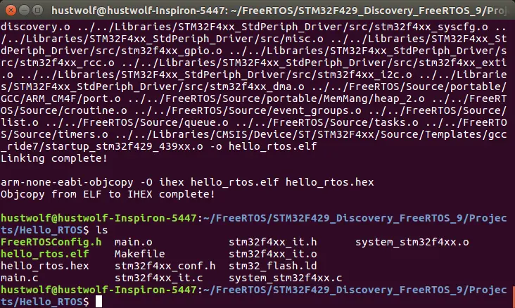 # git clone https://github.com/cbhust/STM32F429_Discovery_FreeRTOS_9.git # cd STM32F429_Discovery_FreeRTOS_9/Projects/Hello_RTOS/ # make如生成hello_rtos.hex文件,说明编译环境搭建成功并编译成功。
