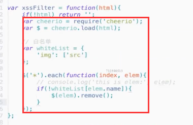 <script>标签,输出的时候过滤比较影响性能。2)白名单:解析html返回dom树(使用cheerio插件)。