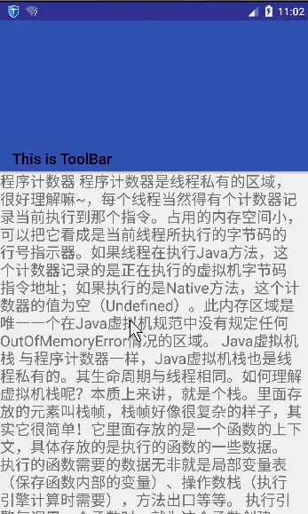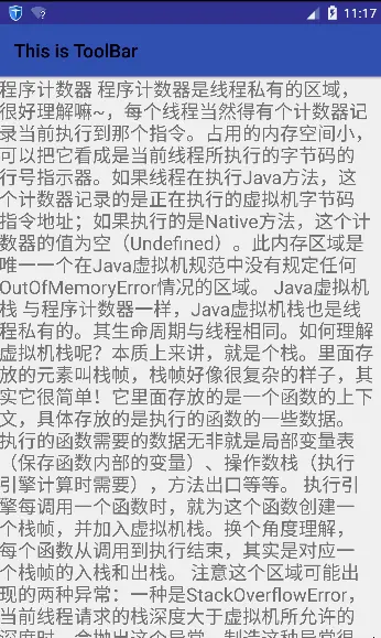 正如你所看的这样,Toolbar根本就不够看的,一点都不复杂。接下来我们继续学习在Toolbar上面再套一层父View,让Toolbar更有互动性。