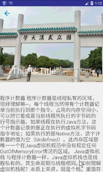 上面的都看得懂吧,每个陌生的属性都是讲过的哦,忘记了的话回头看,稍微解释一下,图片被设置为有视差的滑动,Toolbar设置为固定不动,另外,CollapsingToolbarLayout会对title进行放大和缩小,我们看看效果吧~