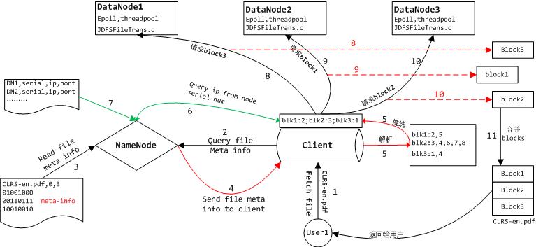 如上图所示,CLRS-en.pdf已经被分成若干个block,每一个block冗余地存储在不同的data node里。这里我们要从云端把组成文件的所有block下载到本地,然后合并还原原始文件。在数字1标志的箭头处,用户user1向Client发出fetch file的请求,并且把文件名CLRS-en.pdf传给了Client. 如数字2,3标志的箭头所示,Client先向Name node发出查询文件CLRS-en.pdf元信息的请求,然后name node在本地的配置文件里找到CLRS-en.pdf的元信息文件,读取后把相关信息发送给Client. 在数字5标志的箭头处我们可以看到Client先解析name node发送过来的数据,解析的结果是CLRS-en.pdf有3个block组成,block 1冗余地存储在data node 2,5上,block2 冗余地存储于data node 3,4,6,7,8上,block3 冗余地存储于data node 1,4上。(因为篇幅有限,图中只列出了data node 1,2,3)。为了获得CLRS-en.pdf,客户端需要把组成该文件的3个block都下载下来。客户端通过特定的策略决定从data node 2下载block1, data node 3下载block2, data node 1 下载block3. 此时Client还不知道data node 1,2,3的ip地址,于是数字6,7,处客户端向name node查询data node 1,2,3的ip地址。接下来数字8,9,10处表示客户端分别从不同的data node下载相应的block, 在11处,Client将3个block合并成原始文件,返回给用户。至此文件获取的过程就全部结束了。