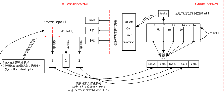 现在让我们把目光从线程池移到server-epoll端。上图左边最上边带“server-epoll”字样的矩形框标志着Http_server_body()被调用,服务端已经启动了。Http_server_body()会先调用Http_server_bind_and_listen()来监听server端的<ip,port>,后续客户端的请求都发送到这个ip-端口所代表的服务端上。监听端口搞定后,接下来我们需要创建一个epoll,并且把监听的socket fd加入到epoll中,接下来我们就需要在一个无限循环中while(1)来不断调用epoll_wait()检测是否有事件发生。上图中server-epoll矩形框下面有三条红色虚线箭头,旁边有一个while(1)也即代表了我们所说的:在无限循环中监测事件的发生。从图中红虚线箭头所指向的逻辑可以看出来,客户端发过来的请求有两种:其一是客户端的连接请求,其二是某个socket fd上监测到读事件(客户端发送数据过来)。