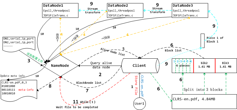 上面这张图描述了我们把算法导论CLRS-en.pdf流式冗余地存储到三个data node的全过程。图中的数字标志了执行的先后顺序,有些线条用同一种特殊的颜色比如黑色虚线,意为这几个步骤逻辑上连接比较紧密。现在我们就顺着数字1,2,3....10来详细看一看具体的过程。在数字1处,用户User1向Client发出存储CLRS-en.pdf的请求,client是提供了若干面向用户的接口,用户可以直接调用该接口来完成相应的功能,从图中我们可以看到用户把CLRS-en.pdf作为参数传递给了Client。然后入数字2标志的箭头所示,Client首先会向Name node发送一个http请求,查询当前虚拟集群里面还活跃着的data node。顺着数字3我们看到name node首先会读取本地的配置文件(里面记录了所有data node的ip地址、监听端口、串号等信息),对于配置文件里面列出的所有<ip,port>对,name node会向<ip,port>标志的服务发送一个查询是否活跃的请求,这个过程用数字4标志的黄色虚线表示,该虚线是个双向箭头,活跃着的data node在接收到name node发过来的查询请求后,会沿着同一个socket-fd(如图中的黄色虚线)发送数据给name node告诉它我目前处于活跃状态,可以提供相应的服务。