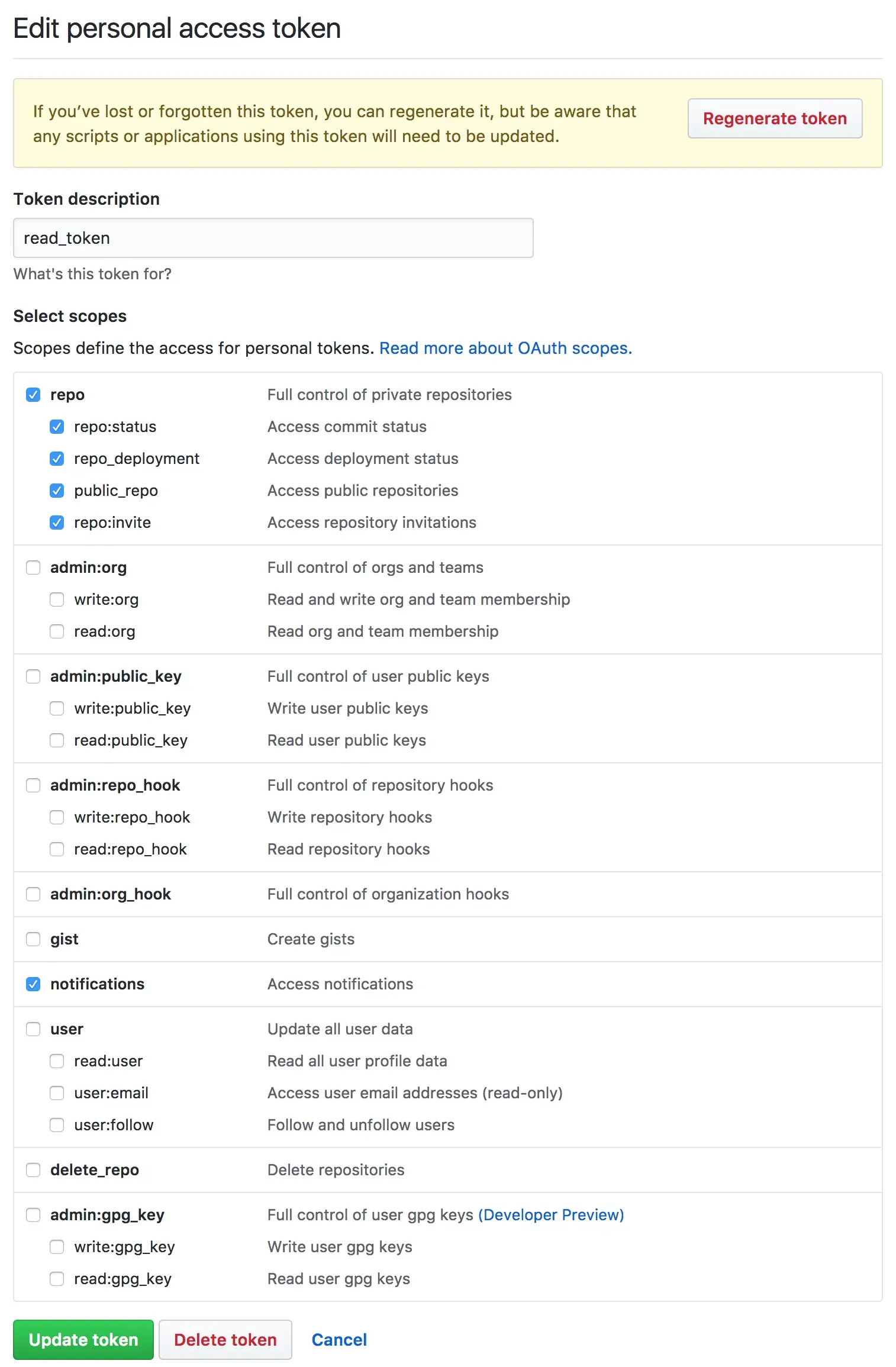 有了接口,我们还需要权限 (access token),在 github.com/settings/to… 中创建 personal access token: