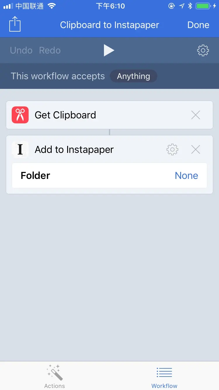 当从微信公众号或者网站看到好文章时,也只需「复制」文章的链接,下滑手机,使用 Workflow 神器 —— 「Clipboard to Instapaper」,保存到 Instapaper 上