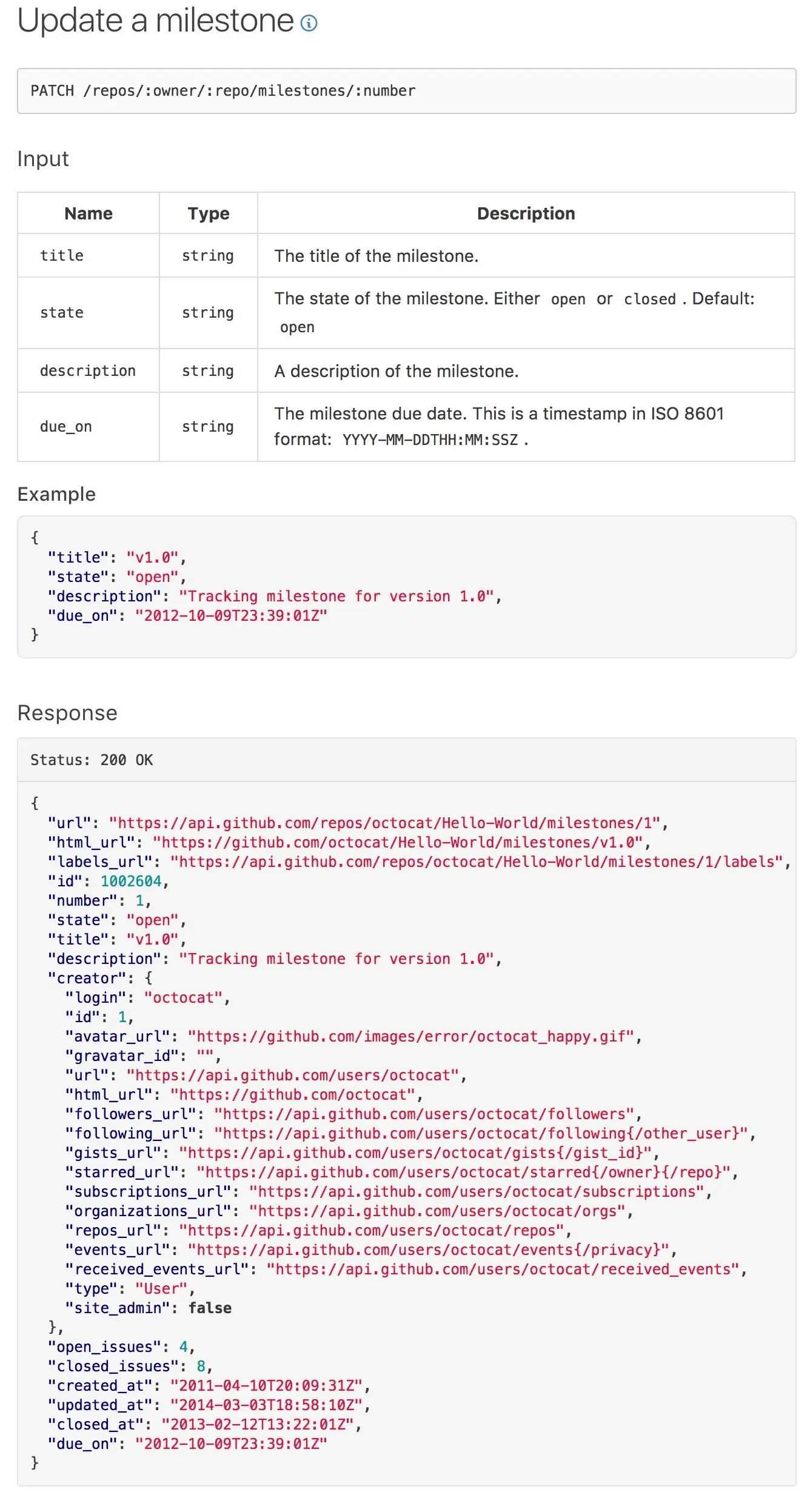 GitHub 的 api 文档也是我们学习的地方。如需要「更新Issue 的 milestone」: