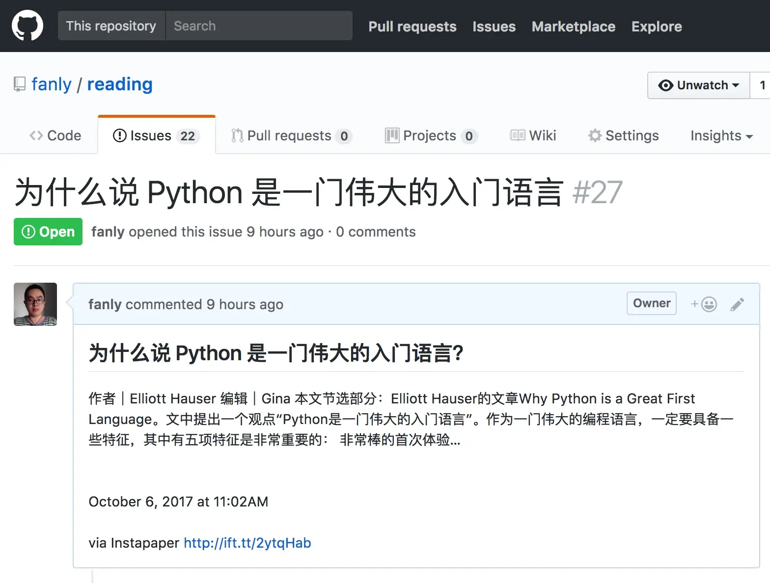 得益于IFTTT非常丰富的第三方服务,IFTTT可以直接创建Instapaper与GitHub Issue相集成的Applet:If new item saved, then create a new issue – IFTTT,就可以在当Instapaper新增文章的时候,自动在GitHub所指定的仓库Issues · JimmyLv/reading 中创建一个新的Issue并添加相应的标题、链接以及描述等相关信息。