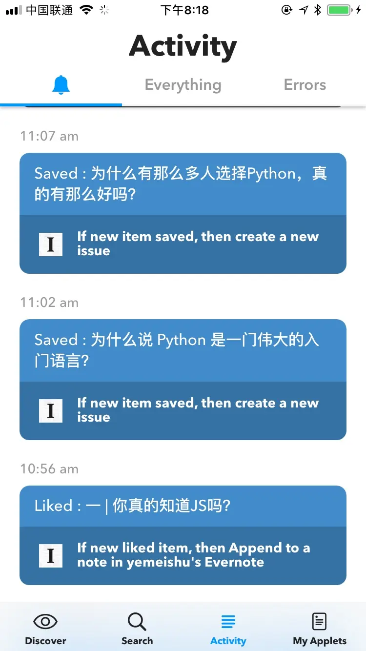当接收到 IFTTT 的 notification 时,并且在 Activity 可以看到每次运行 Applet 的状态: