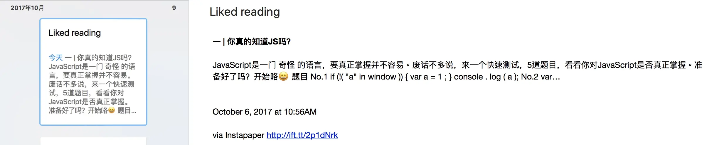最后附上一个对于喜欢的文章我们如何进行汇总呢,这里我还是使用 IFTTT 的 Applet,当你对某一篇文章喜欢时,只要触碰「❤️」按钮,即可将文章汇总到印象笔记中,看图不说话:
