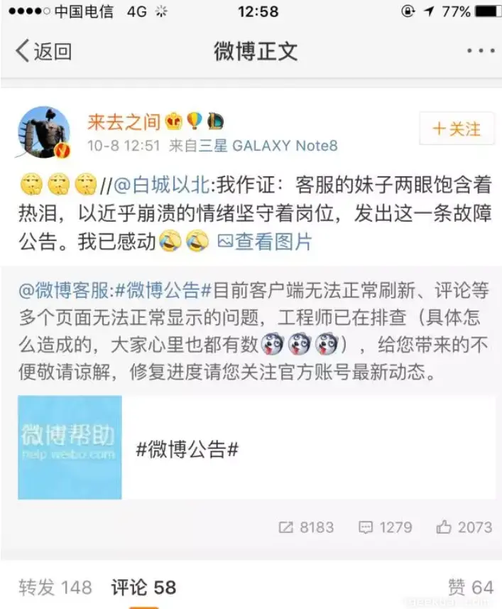 恭喜微博程序猿紧急加班 igeekbar 2017-10-08 93 阅读1分钟 每次遇到大事件,微博必故障,微博客服公告:#微博公告#目前客户端无法正常刷新、评论等多个页面无法正常显示的问题,工程师已在排查(具体怎么造成的,大家心里也都有数),给您带来的不便敬请谅解,修复进度请您关注官方账号最新动态。 哈哈哈哈哈 比鹿晗没了更惨的是 你的长假只剩半天啦。。。。。。。 而我只想和。。。。。。 国庆节 在一起!!!