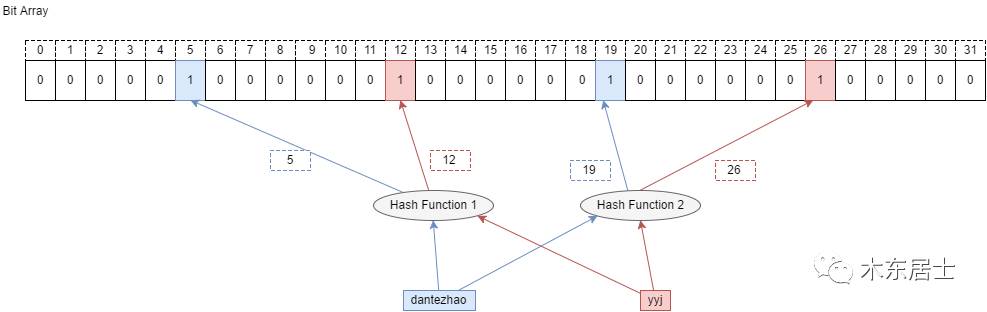 基本的原理就是这么多,看一下图中的例子就能明白了。比如现在要 dantezhao 用 BF 表示,我们会用两个哈希函数分别对 dantezhao 计算,计算结果分别是5和19, 然后对位数组中的第5位和第19位分别置1即可。