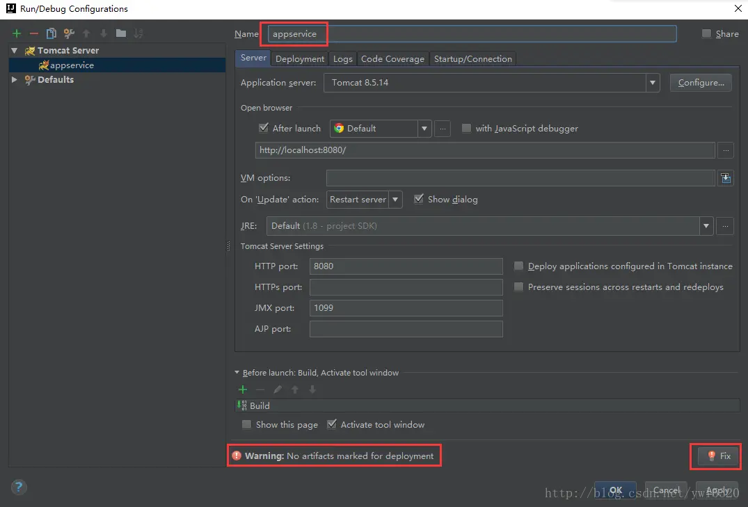 7.3.3、填写tomact名称并添加7.2中创建的war文件,如图,点击右下角fix可自动添加
