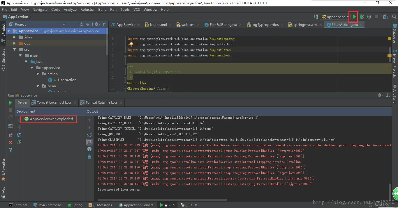 点击tomact叛变的运行按钮即可,发布成功左下边会显示OK状态