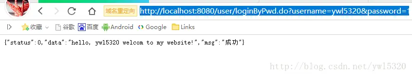访问URL:http://localhost:8080/user/loginByPwd.do?username=ywl5320&password=123456(这里为了方便测试,使用的是get方法,正式项目中应该用post方法)