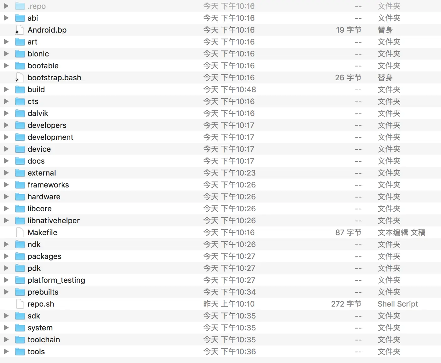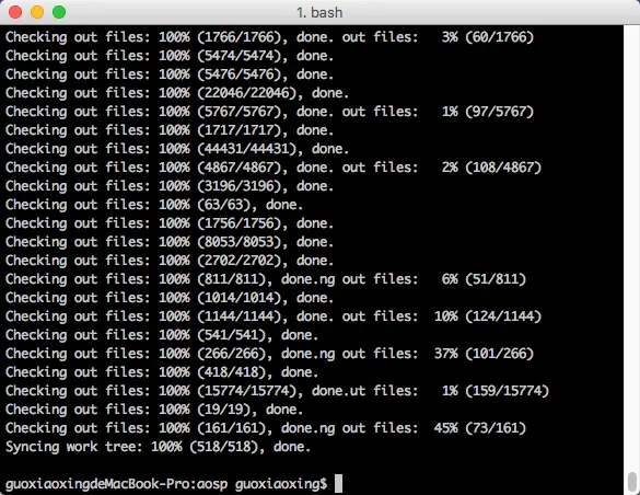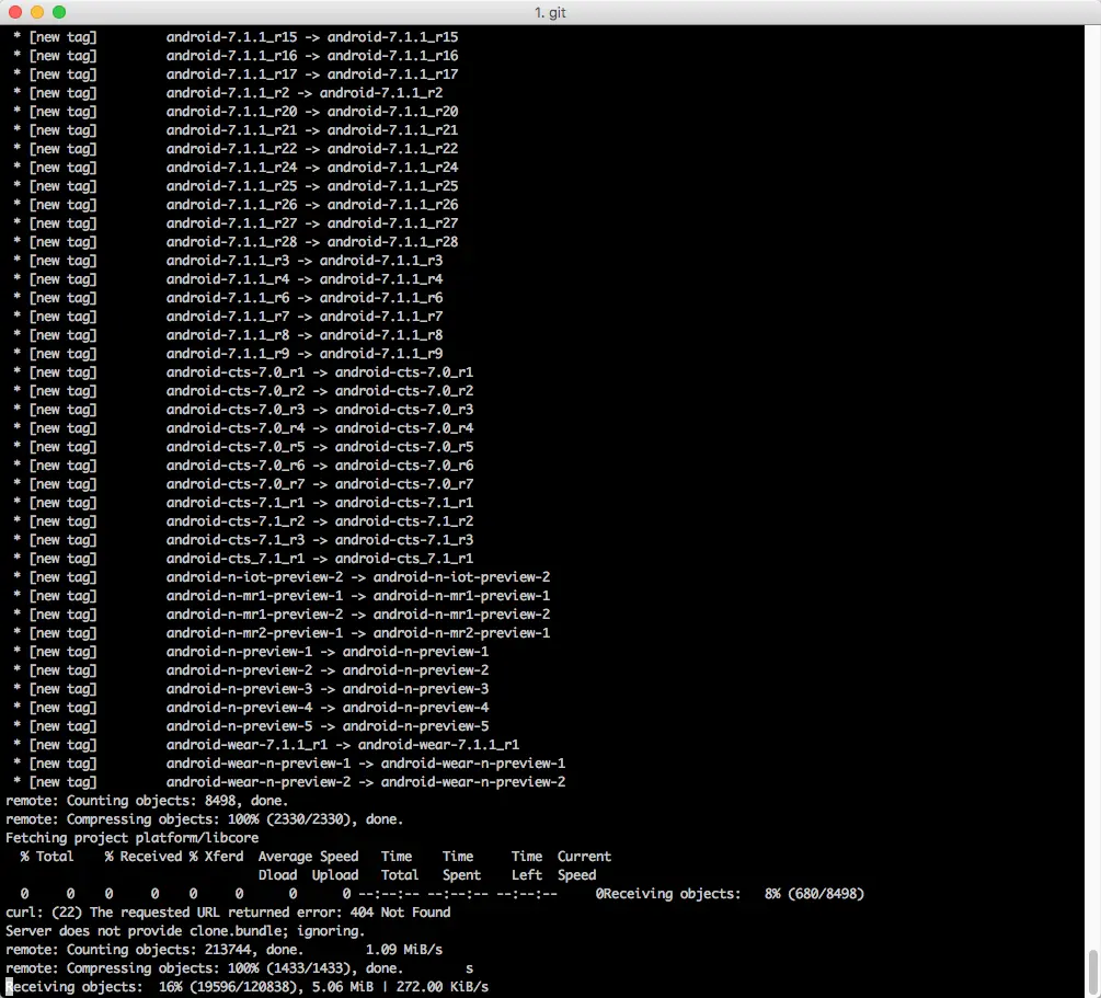 同步源码树,开始下载源码,如果后续下载中断,也可以重复执行这个命令。