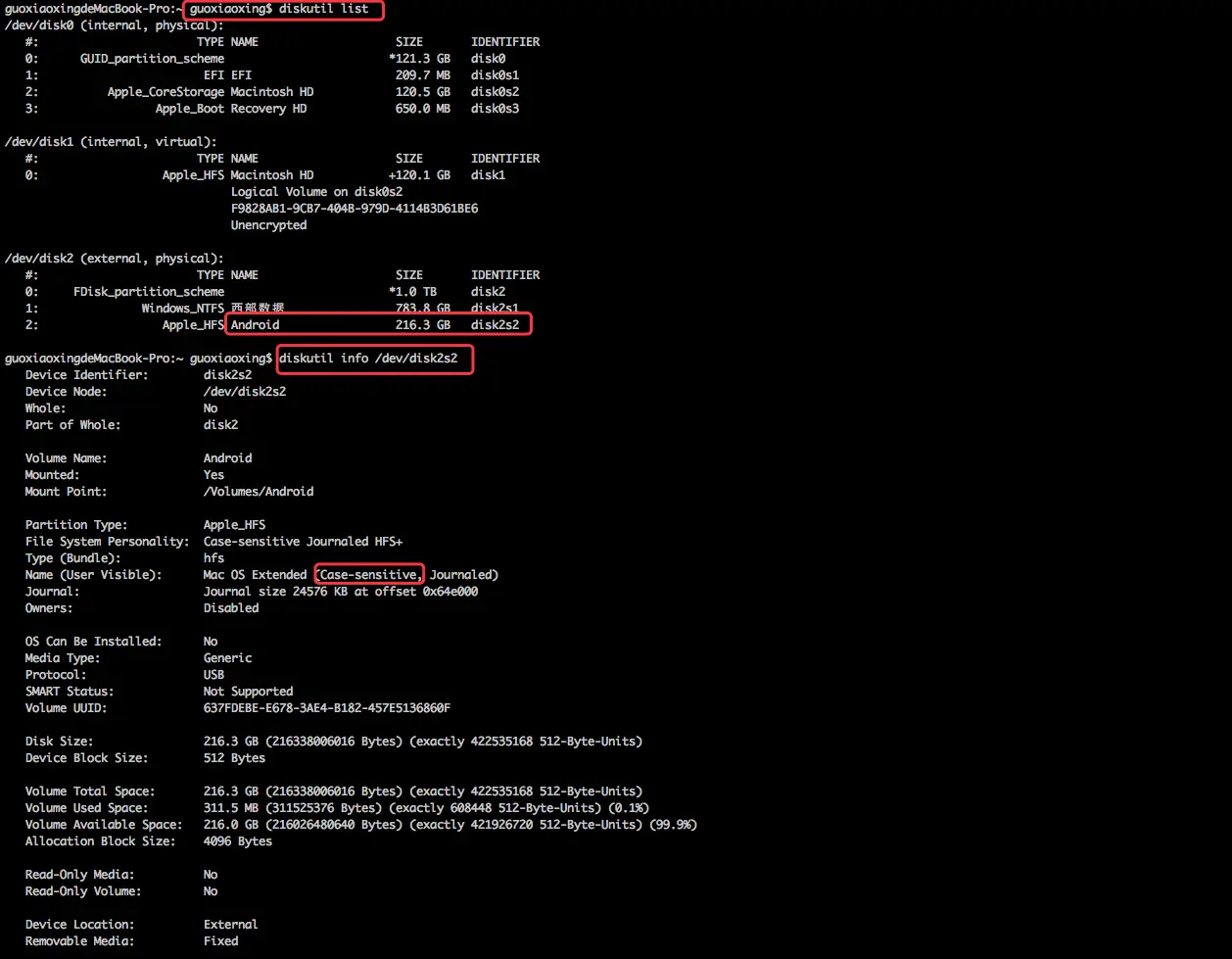 搞不清自己磁盘格式的同学,可以用diskutil info 命令看一下,只有有case-sensitive字样的才是区分大小写的磁盘,其他的都是耍流氓。😤