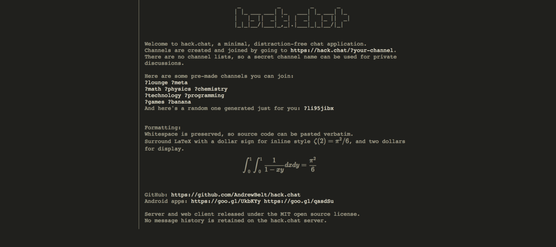 Hack.Chat 是一款在线聊天的网站,黑客的聊天网站,顾名思义一定是很 Geek 的。在这上面来,你可以选择临时创建频道聊天,与此同时所有人的聊天记录都不会被网站所记录。只要你关闭网页聊天窗口时,你在聊天室的数据也会被同时抹除,不留任何痕迹,而且每一次新建的时候都会提示你重新输入一个新的临时用户名,可能这已经达到了极高的隐私保护效果,就像黑客一样「去无踪迹」。除了在浏览器上可以使用它之外,开发者也提供了一款 Android App 给各位使用,可以在 Google Play 进行 下载。