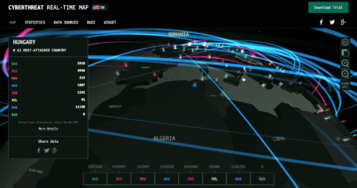 CyberThreat Real-Time Map 是一个实时展示全球恶意软件攻击的地图,在地图上有很多明亮的弧线,就是黑客入侵的活动。当然,除了可以直观看到全球黑客的攻击活动情况,还可以查看各国被攻击的数据,但是点开每个国家的详情的时候,反正我是不知道上面说的是什么的,如果你是个「内行」人就来看看门道,像我这种「外行」,我们就看看热闹,没事点出来在别人旁边秀一把就好了,因为他多半也不知道。