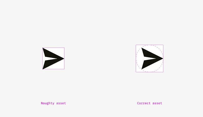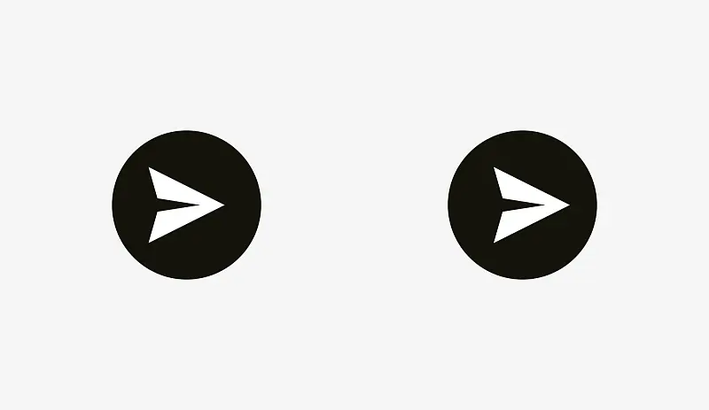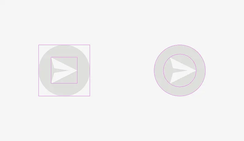 希望你注意到左边的有些问题。这是因为不同的对齐方式。第一种是将图标当成了矩形。在一定程度上是正确的,因为发送给开发的SVG或PNG文件是带有矩形框的飞机。右边的变体显示了图标所有边缘与圆形按钮背景有相同的距离。