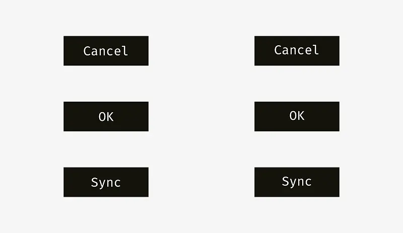 下图更多例子用来对比说明。左边一列是代表大写字母高度的方法,“Cancel”和“OK” 用此方法显然更好,这两个按钮应用非常广泛,因为“Cancel”没有降部,而“OK”则全是大写。右边一列代表是“x-height”方法,显然只对“Sync”按钮更好,因为其同时具有升部和降部;“Cancel”和“OK”则好像被放置的太高。