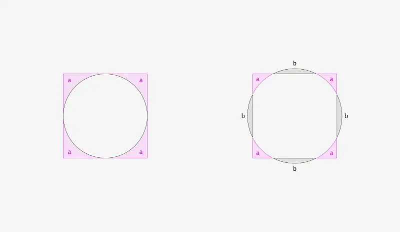 为了说明发生了什么,我将上图中的圆和方放在了一起(如下图)。左图中,同样是400px的方和圆,方比圆多出了“a”区域,因此看起来方比圆大。而在右图中,450px的圆超出正方形的“b”区域面积与“a”区域基本平衡,所以看起来差不多大小。总之,左边是高度和宽度相等,而面积不同;右边虽然宽高不同,但面积却相等。