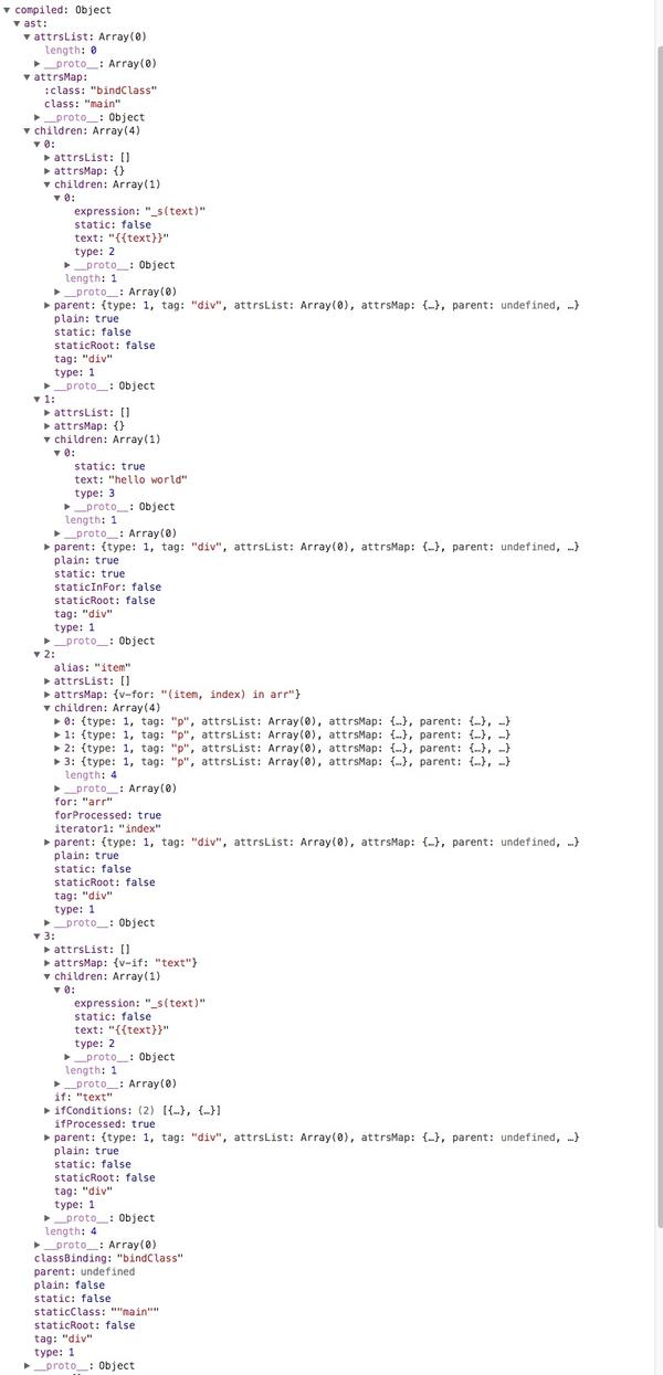 至此,我们的template模板已经被转化成了我们所需的AST语法树、render function字符串以及staticRenderFns字符串。