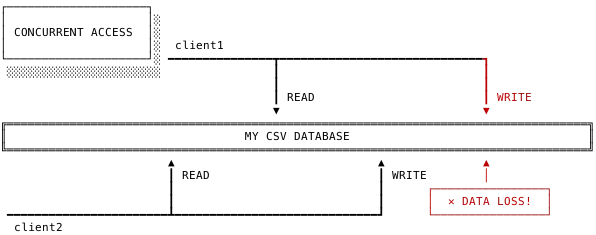 不幸地是,当两个客户端同时试图去操作数据的时候,新功能立即被出现的问题所困扰。当一个 CSV 文件正在被一个客户端读取,修改,和写入数据的时候,如果另一个客户端也尝试去做同样的事情,这个时候就会发生冲突。