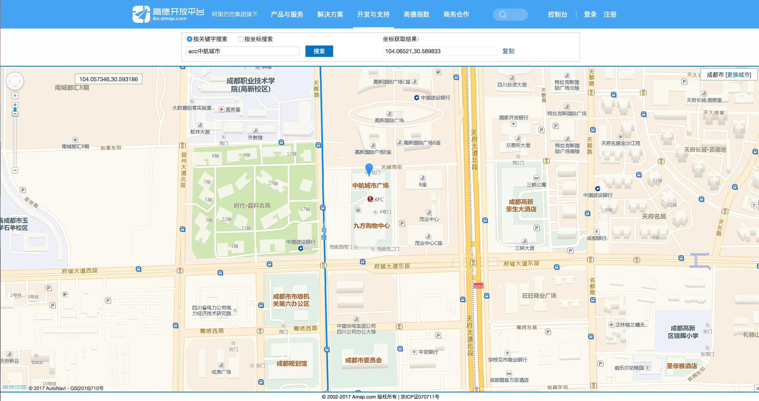 iPhone所需要的坐标是WGS-84,我们获取的是GCJ-02,这里我们利用最新飘逸还原算法来转换出你所需要的真实坐标。 我所在的定位四川省成都市ACC中航城市广场原始坐标为: