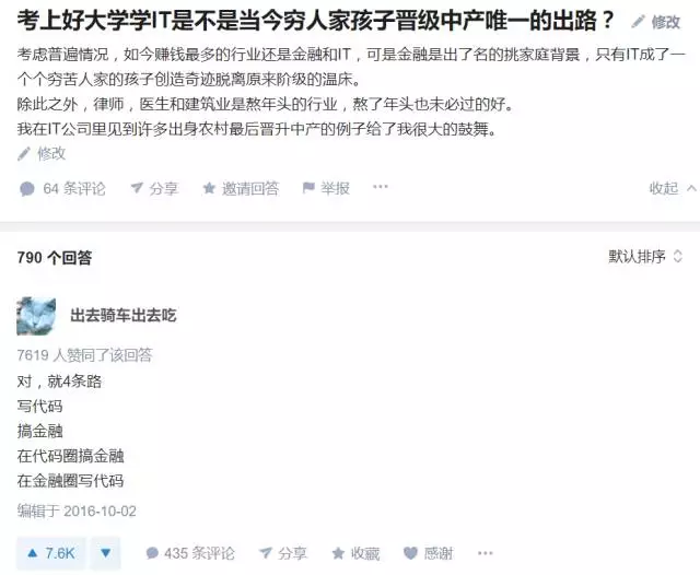 在知乎上有这样一个问题:考上好大学学 IT 是不是当今穷人家孩子晋级中产唯一的出路?截止AI科技大本营发稿时间,这个问题已经有 13186 个关注者,790 个回答,浏览量超过 120 万次。