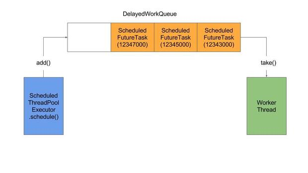 在Timer里定时功能的实现主要依靠TimerThread.mainLoop()的等待,而ScheduledThreadPoolExecutor使用的是多线程,在每个线程里都单独实现定时功能是不现实的,因此,ScheduledThreadPoolExecutor将定时功能放在了DelayedWorkQueue类里,而由于DelayedWorkQueue是阻塞队列,所以定时任务的实现实际上就在DelayedWorkQueue.take()方法中。下面我们就来分析一下DelayedWorkQueue.take()到底做了什么。