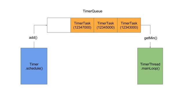 TimerThread会在Timer初始化后启动,之后会进入mainLoop()方法,该方法会不断从TimerQueue中取出时间点最小的TimerTask。如果该TimerTask的执行时间点已到,则直接调用TimerTask.run()执行;否则,调用wait()方法,等待相应的时间。