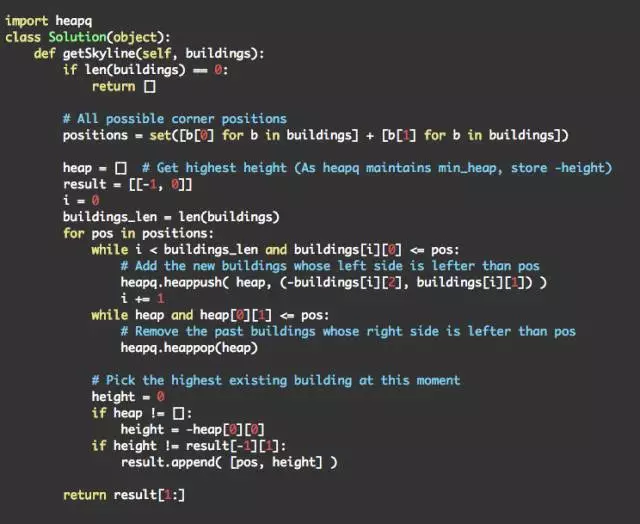 暴力解法:由于输入已经按照大楼位置排好序了,所以我们可以直接获取每栋大楼的高度?但如果大楼A太矮小,被大楼B挡住了,那么大楼A的高度是不会出现在答案里的,所以这个方法不可行。那我们试试把区间拆开来,用扫描线的方法?似乎可行:按顺序扫一遍 x 轴上的每个 Li、Ri,然后判断当前这个大楼棱角要不要输出。时间复杂度是 O(n)。不过问题在于“判断当前坐标要否输出”,你不得不枚举每一种可能的情况(比如大楼A是不是在大楼B的阴影下啦,两座大楼高度是否一样啦,等等),然后写一大堆奇丑无比的 if-elif-else。姑且当你能枚举完所有情况(也没几种可能的情况?图样图森破~)并正确写完这一坨 if-else,但这样不仅耗时,而且代码的可读性可维护性都极差。